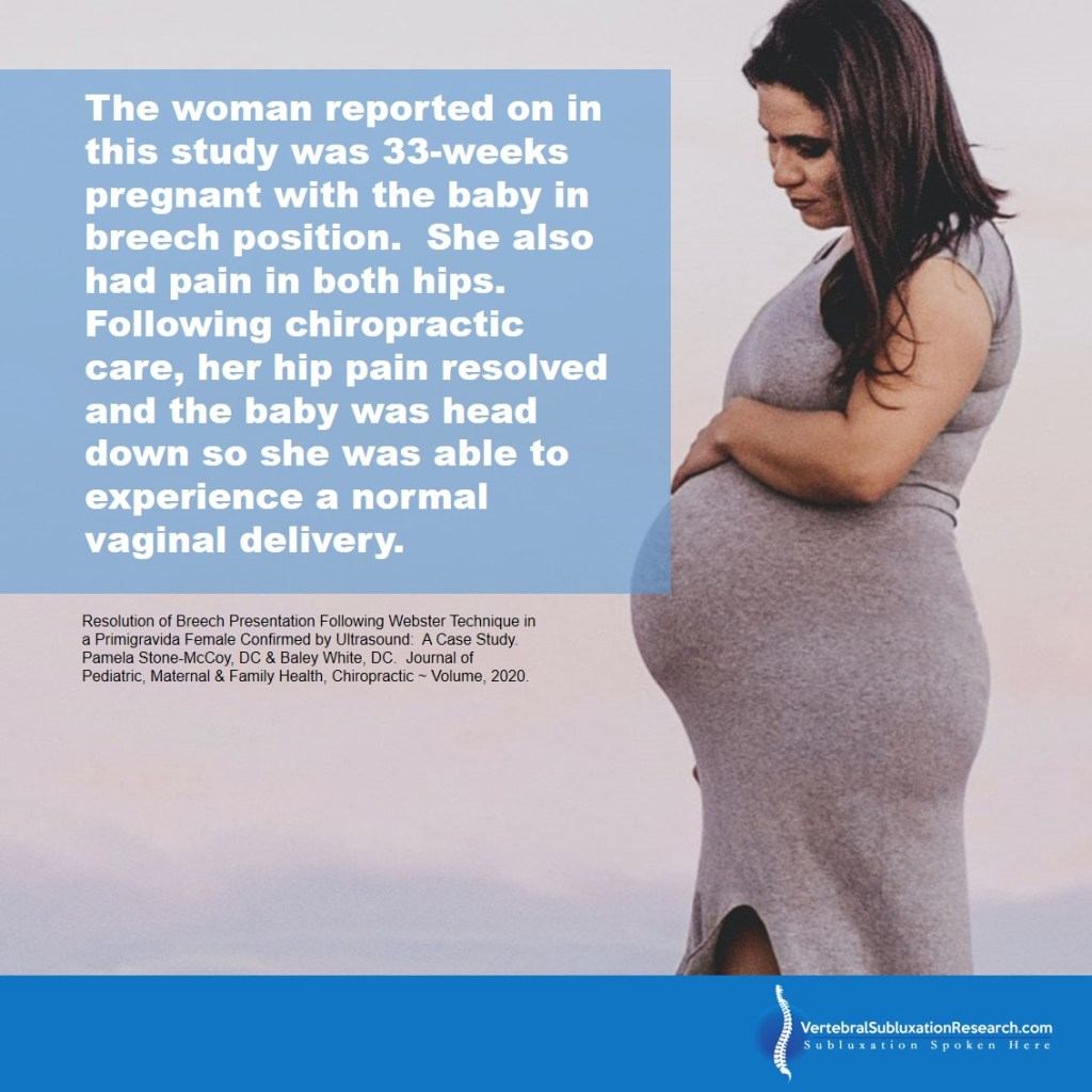 Intervention and Outcomes: Over the course of one month the patient was managed utilizing Webster Technique to determine sacral subluxations. After 7 visits, her hip pain decreased and the fetus was found to be in the vertex position which was confirmed by ultrasound. The patient continued chiropractic care until the successful vaginal delivery of the baby.